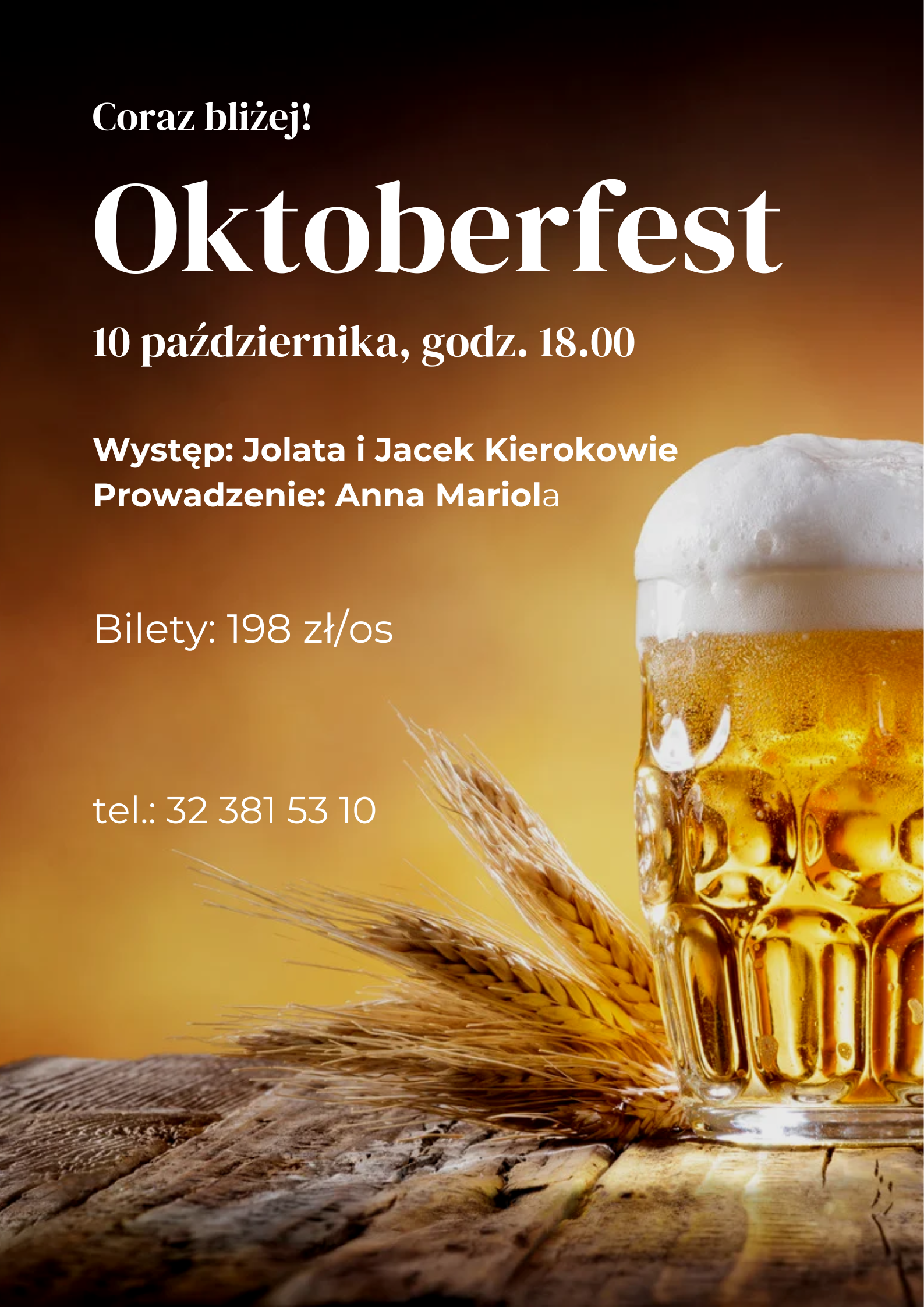 Odliczamy dni do Oktoberfestu! 10 października czeka nas wieczór pełen serdecznego uśmiechu, dobrej zabawy i dobrego jedzenia! Wystąpią Jolanta i Jacek Kierokowie, a nasi kucharze proponują na ten wieczór następujące menu: Danie główne: golonko pieczone w piwie podane na kapuście zasmażanej. Ponadto podamy: tradycyjne precle, sałatkę ziemniaczaną, smalec z jabłkiem…