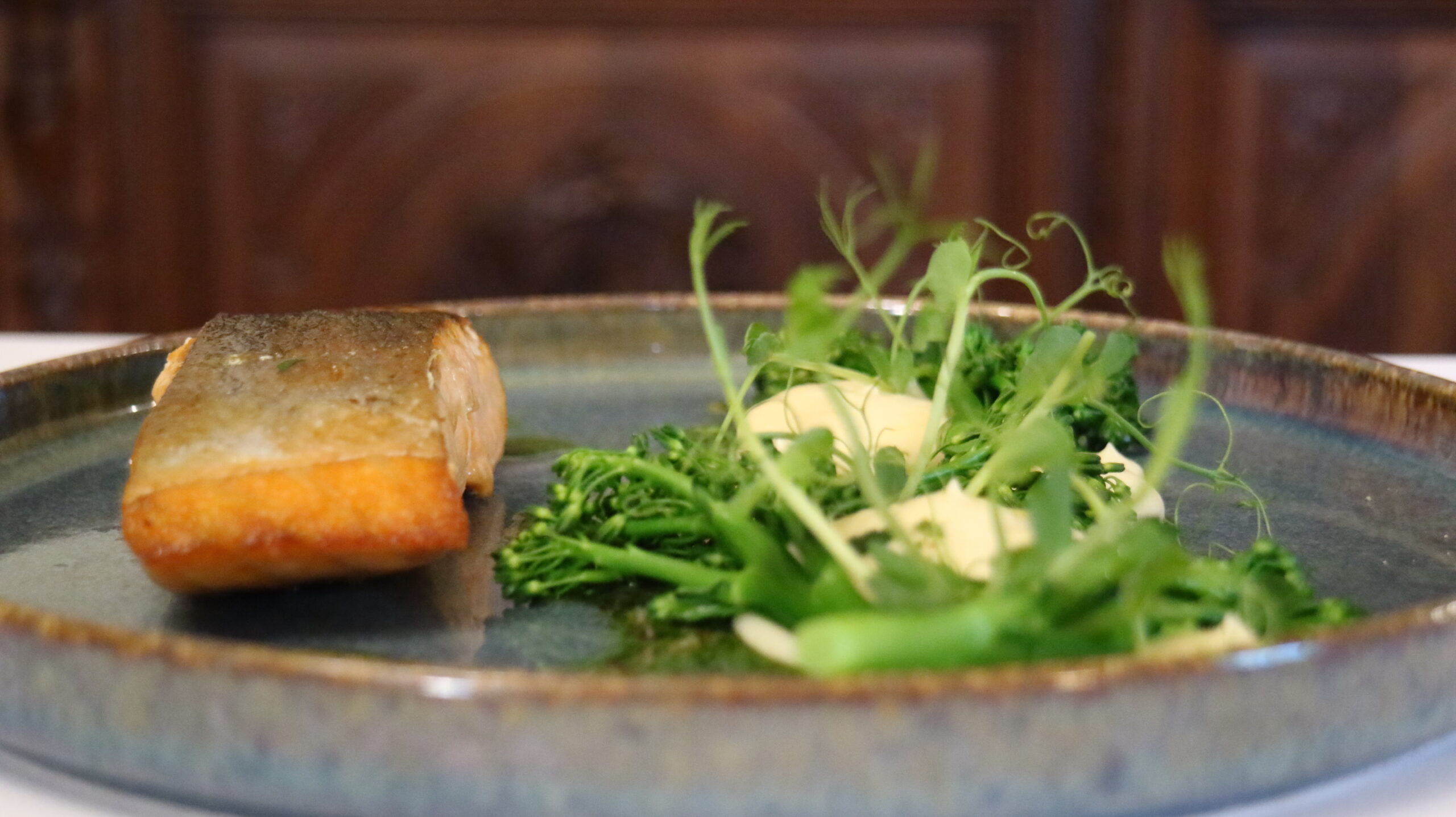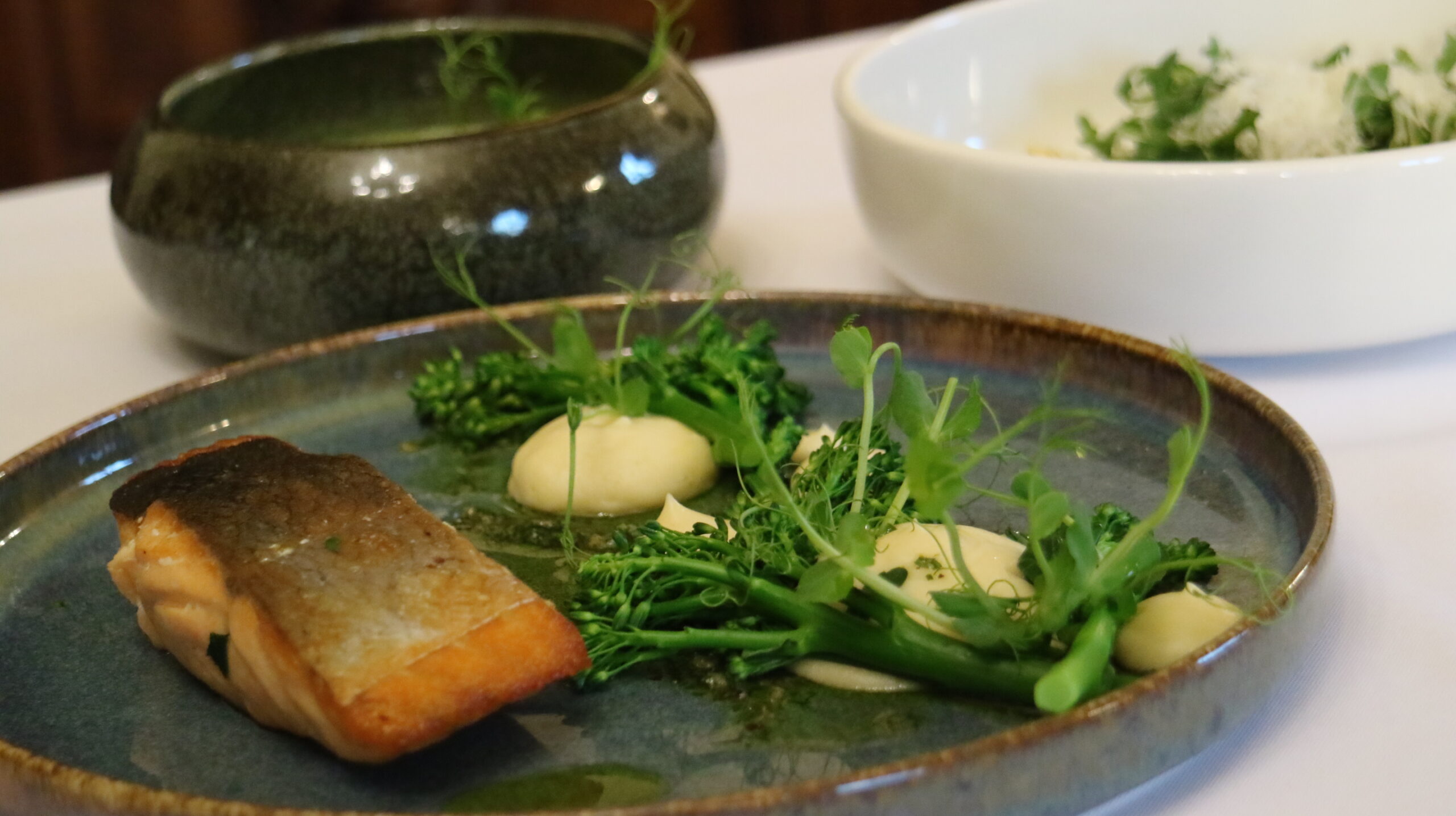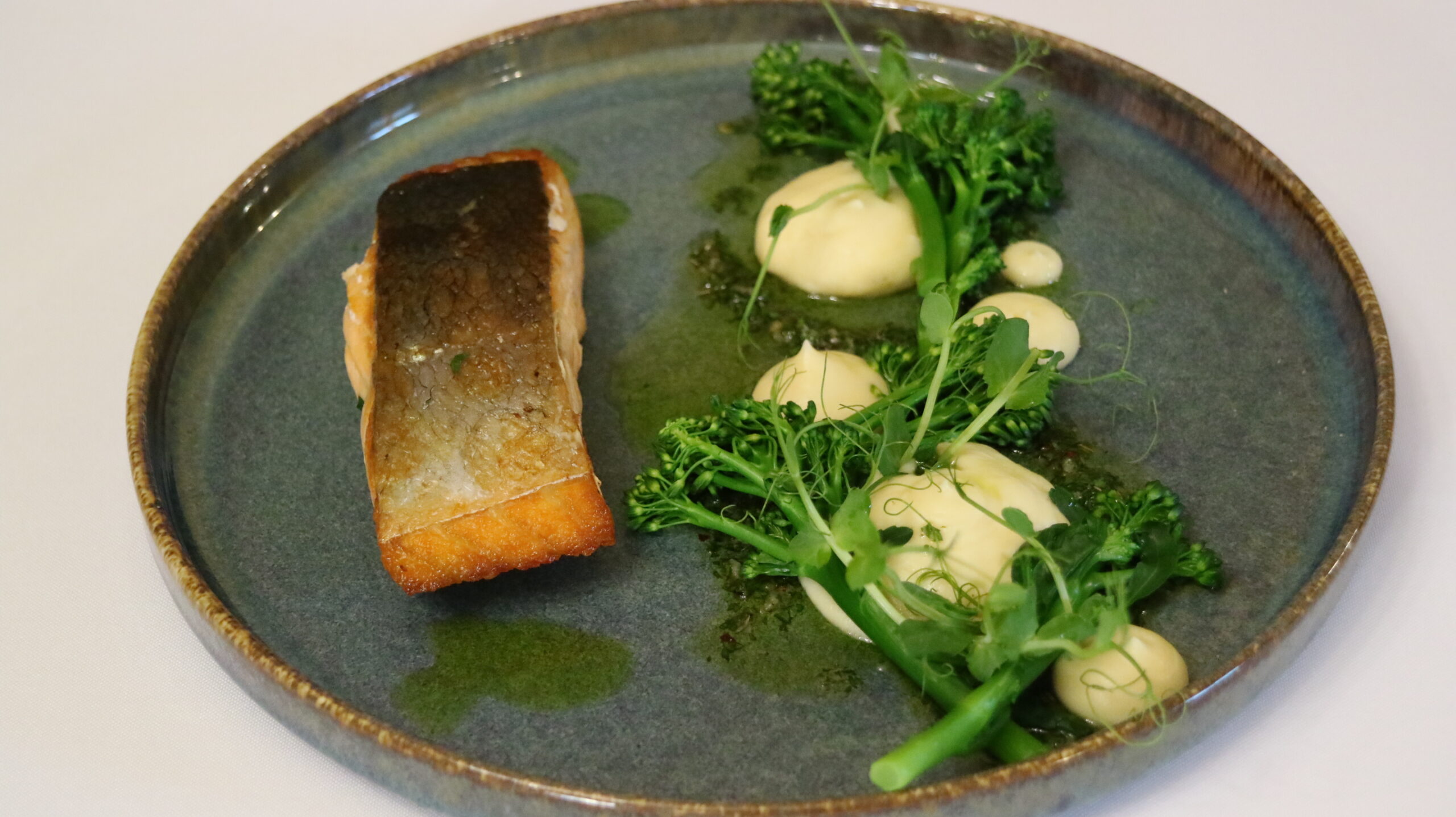 łosoś, purée z selera, brokuł bimi, chimichurri;